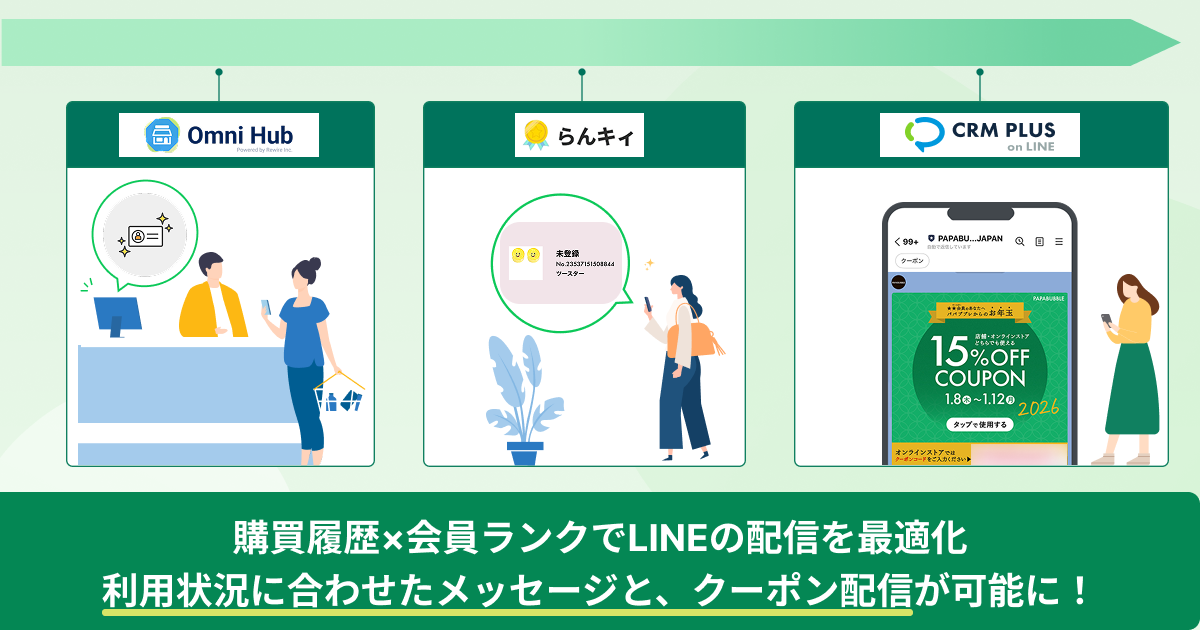現在は、「CRM PLUS on LINE」「らんキィ」「Omni Hub」を連携させることで、会員ランクやこれまでの利用状況に応じて、お客様に合わせたメッセージを届けられています。