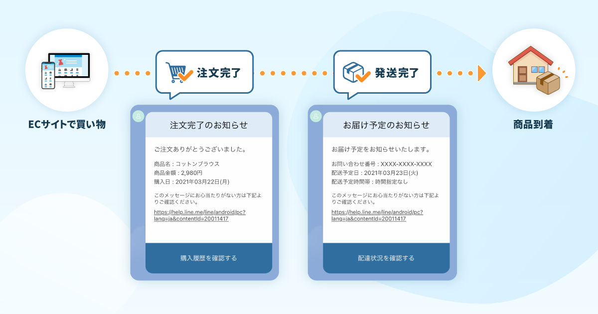 LINE通知メッセージ機能を活用することで、注文・発送完了通知を身近なLINEでお届けできるようになります。電話番号ベースで配信するため、会員登録していないゲスト購入者やLINE公式アカウントの友だち以外のユーザーにも配信可能です。