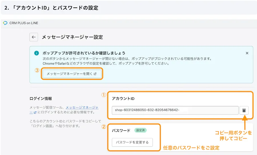 CRM PLUS on LINEの管理画面「ホーム」>「メッセージマネージャーを設定する」より、パスワードを作成してからログインしてください。