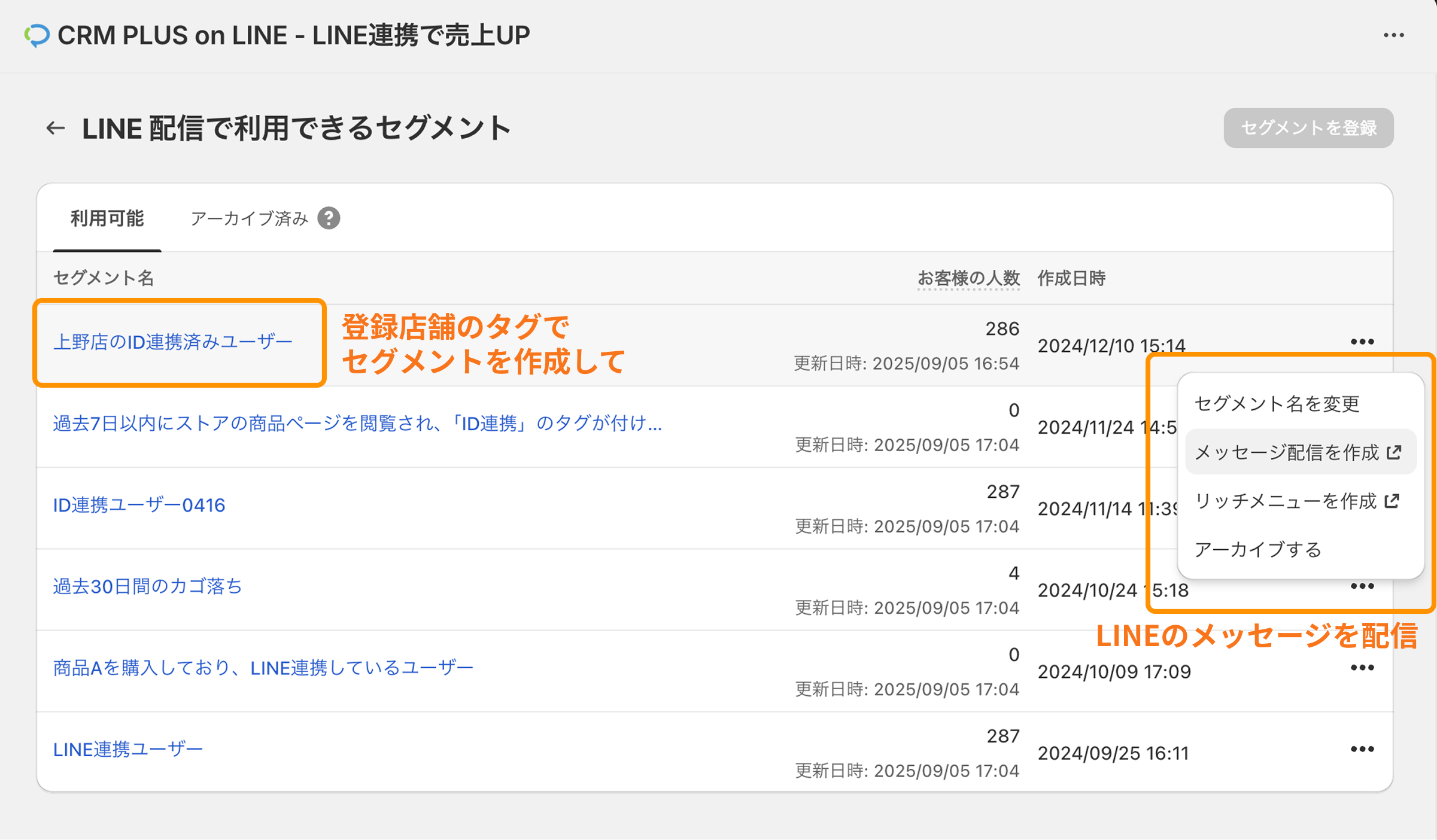 会員登録時に取得した流入経路(例:登録店舗)のタグで配信先を絞り込み、LINEでセグメント配信が可能です。