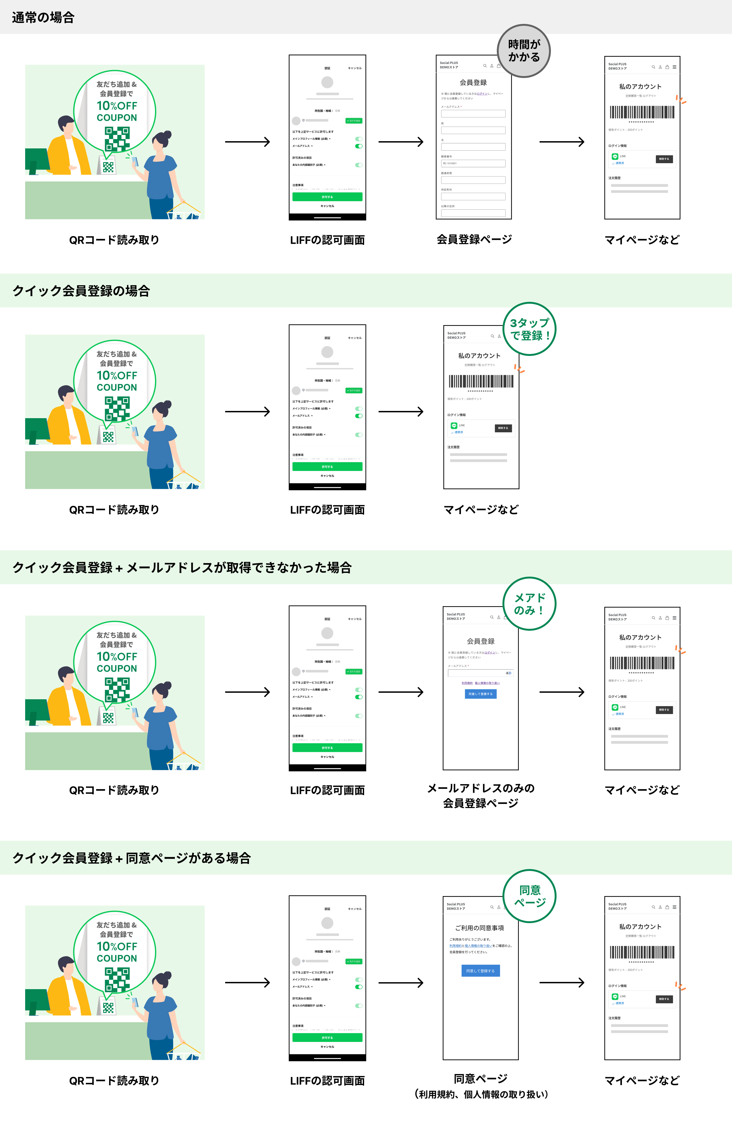 LINEログインを利用することで、会員登録のフローの中でLINE公式アカウントへの友だち追加・LINEのID連携も促せます。