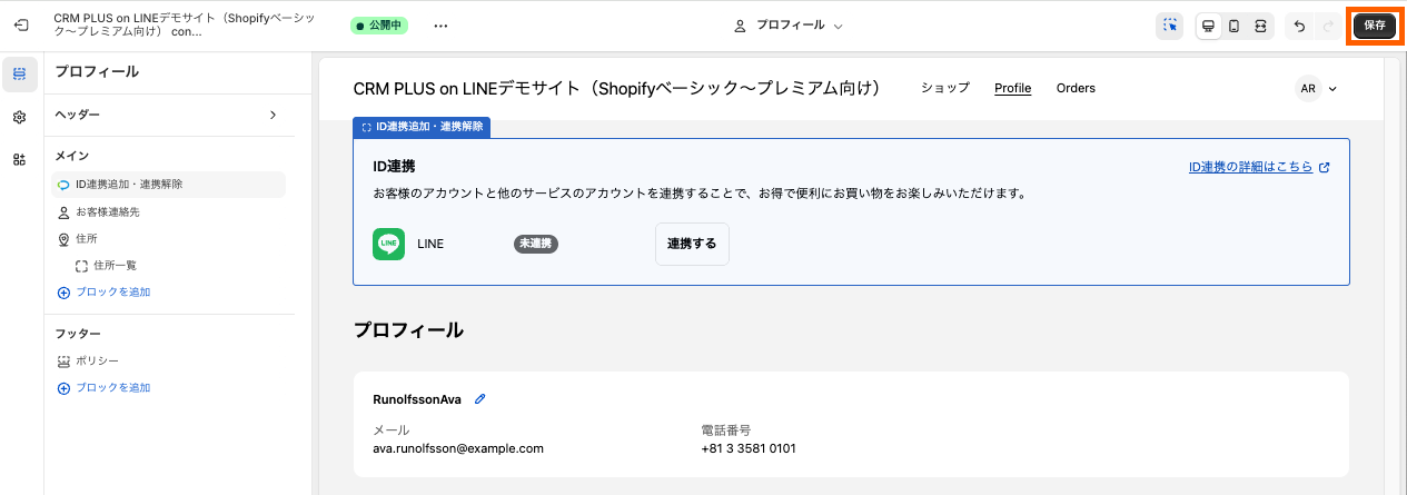 本機能はShopifyの会員IDとLINEのユーザーIDの紐付けを行なうためのLINE連携ボタンを、マイページ(プロフィールページ)に設定できる機能です。