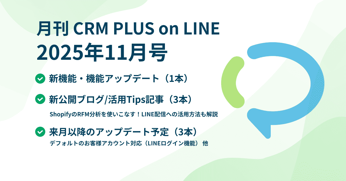 LINE連携Shopifyアプリ「CRM PLUS on LINE」のアップデート情報・新着事例・アプリ活用ブログ記事の更新情報などを、月ごとにまとめました。