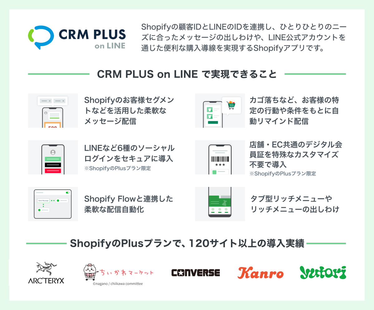 CRM PLUS on LINEは、Shopify上の会員とLINE公式アカウントの友だちを連携し、ひとりひとりのニーズに合ったメッセージの出しわけや、LINE公式アカウントを通じた便利な購入導線を実現するShopifyアプリです。LINEログインなど6種のソーシャルログインやLINEミニアプリ(会員証)も導入可能。初期設定の無料サポートも行なっています。